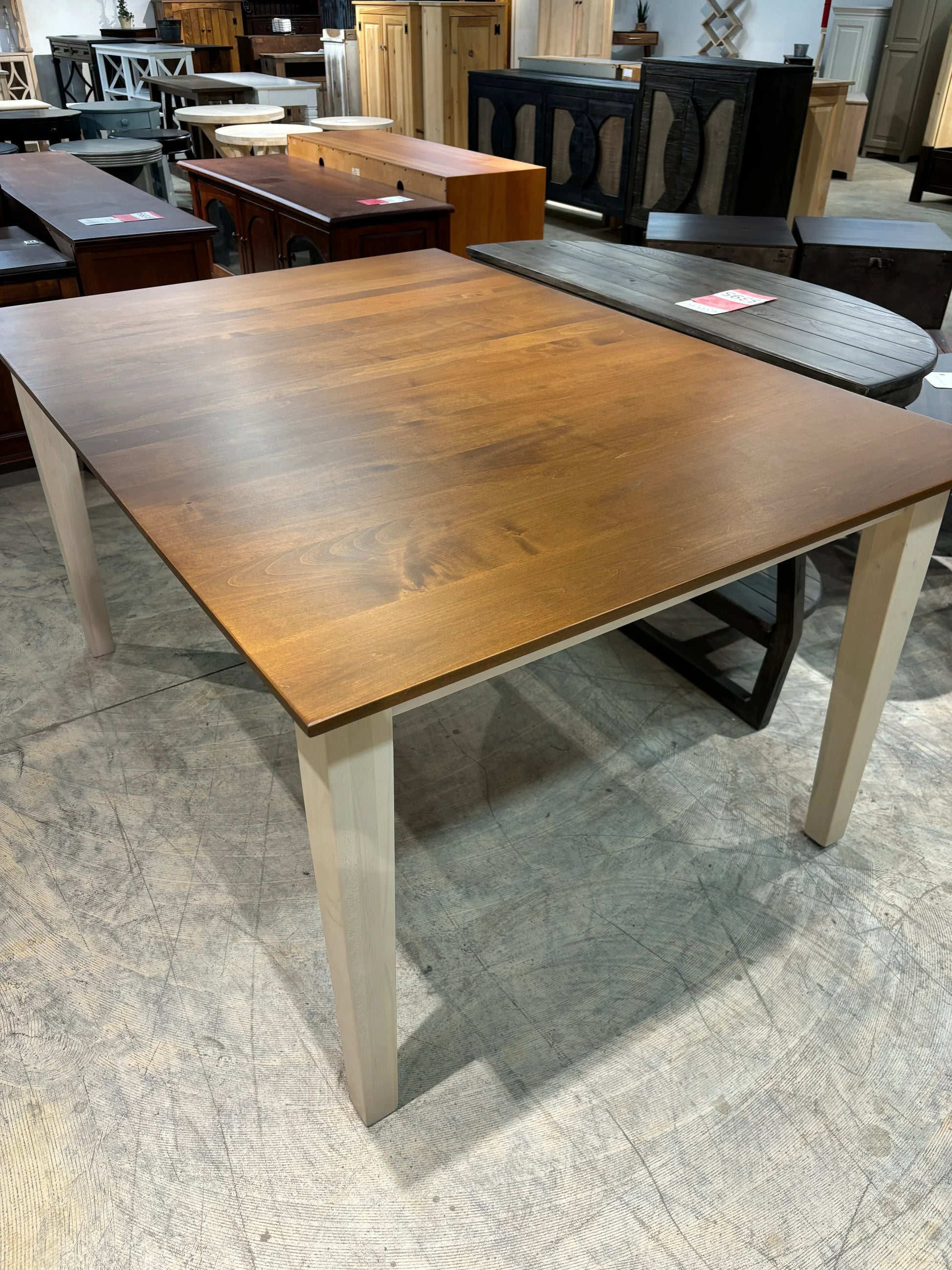 Cette table en érable massif, fabriquée aux États-Unis, présente une finition bicolore. Elle mesure 12,7 m de large sur 18,3 m de long.